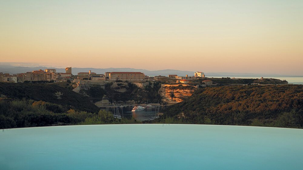 Depuis la piscine à débordement, le spectacle se déploie : la mer s’étire à l’infini, les remparts se dessinent et, par-delà le détroit, se devine la silhouette lointaine des côtes sardes. Un sentier discret permet même, en une quinzaine de minutes à pied, de rejoindre le port.