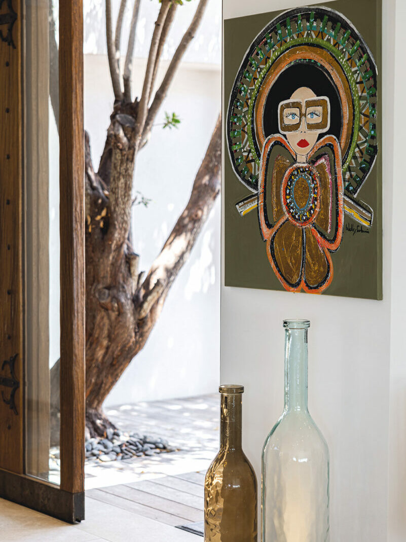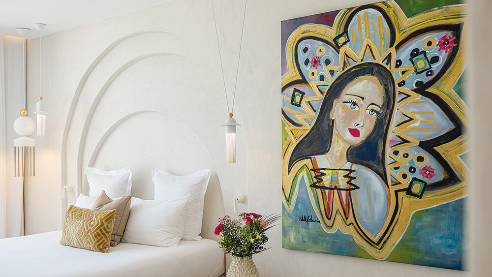 Mais Cala di Greco n’est pas qu’un havre pour les voyageurs : c’est aussi un lieu où l’art et l’hospitalité se rencontrent. Fidèle à son désir de tisser des liens avec la scène artistique insulaire, l’hôtel accueille les créations de l’artiste corse Isabelle Carbuccia, dont les œuvres dialoguent avec l’architecture et la nature environnante. Couleurs vives, effets de matière, les compositions de l’artiste habillent les murs de tout le domaine. Ce partenariat illustre une ambition : valoriser les talents locaux et offrir aux hôtes une expérience où l’esthétique contemporaine s’ancre dans l’identité profonde du territoire.
