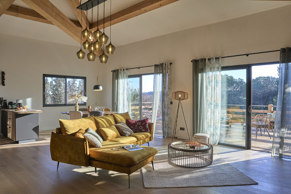 Ouverte sur la terrasse par de larges baies vitrées, la pièce de vie bénéficie d’une luminosité naturelle. Les poutres apparentes en bois soulignent le caractère du lieu.