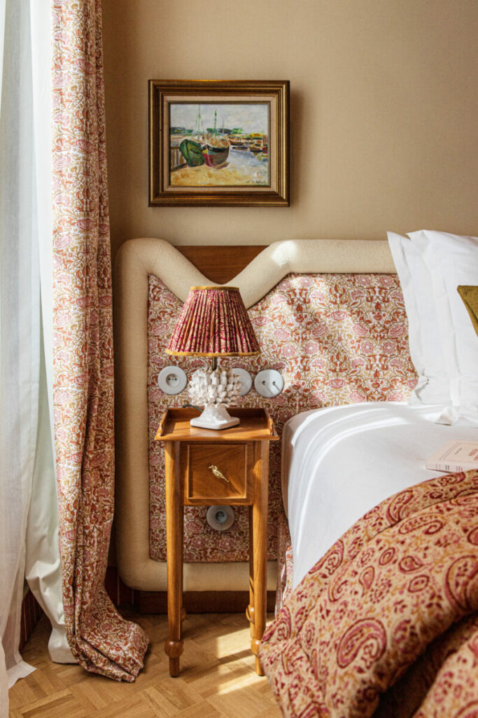 Les chambres mélangent esprit classique et détails plus graphiques. Les têtes de lit sont habillées d’un tissu à motif floral, encadré par une structure arrondie en textile uni. Les lampes jouent la carte décorative : pied sculpté, abat-jour plissé ou imprimé.