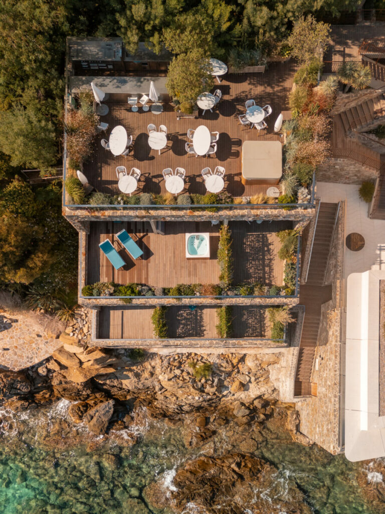 Niché dans la baie d’Aiguebelle au Lavandou, l’hôtel Les Roches semble être pensé comme un « hôtel-bateau ».