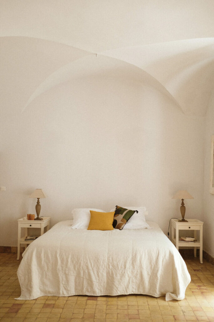 La décoration s’appuie sur une base très naturelle. Les murs sont enduits dans des tons blanc cassé, les sols en carreaux anciens ou en pierre claire. Les chambres sont simples : lit centré, linge blanc, tables de chevet assorties avec lampes en bois et abat-jour en toile. Quelques coussins aux tons ocre ou vert apportent une légère touche de couleur.