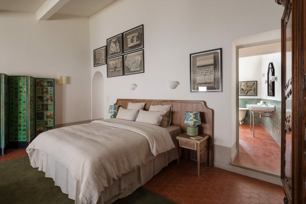 Le mobilier, chiné par Agnès et Françoise Costa, mélange influences provençales, miroirs plus classiques, pièces en céramique et tables signées Roger Capron. On retrouve aussi des dessins inspirés de l’Antique, en lien avec l’histoire romaine du quartier. Le dernier étage ouvre sur une terrasse avec vue sur les toits d’Arles, prolongeant cette idée de maison en ville.