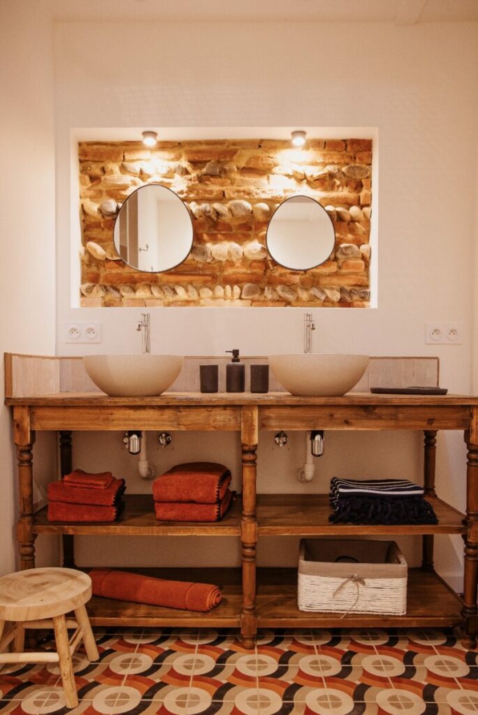 À l’intérieur, le bois est très présent, notamment dans les meubles de salle de bain, associé à des vasques rondes et de grands miroirs. Les murs alternent carrelage vert foncé et briques apparentes avec galets, apportant de la matière sans surcharger. Dans les chambres, les tons beige et rose clair dominent, avec du linge uni et un éclairage mural simple, pour une ambiance douce et équilibrée.