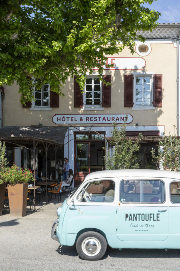 À Marsanne, au cœur de la Drôme provençale, Pantoufle s’installe dans une bâtisse de 1905 située sur la place centrale du village. Façade en pierre, tuiles romanes, structure ancienne : le lieu conserve son architecture d’origine.