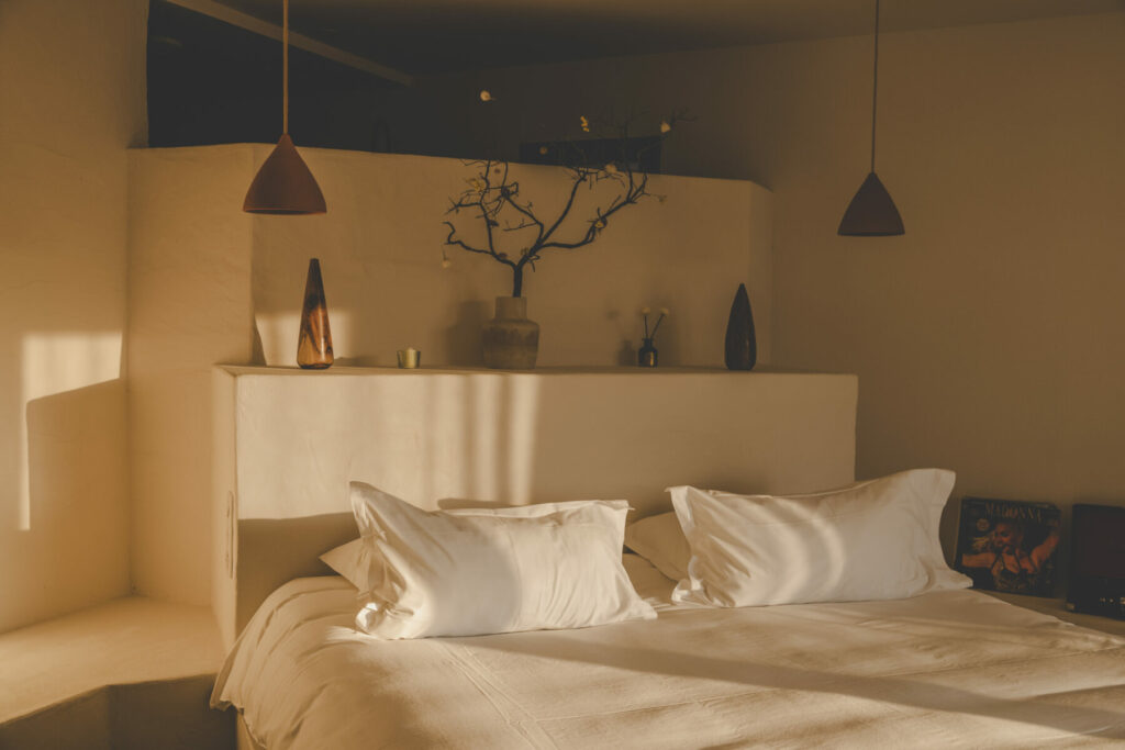 Le lit est posé sur une structure maçonnée, avec linge blanc et lignes simples. Sol en béton ciré, bois brut pour le mobilier, fibres tressées en accessoires.