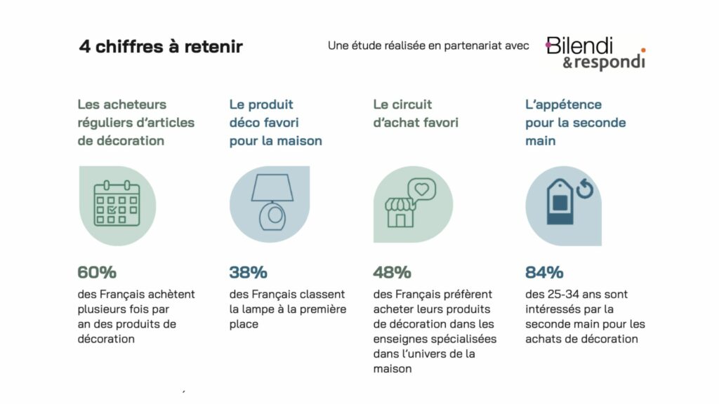 Cette étude met en évidence que 60 % des Français achètent plusieurs fois par an, ce qui souligne l’importance de la récurrence dans ce marché. Les lampes apparaissent comme le produit « phare », choisi par 38 % des consommateurs. 48 % des Français déclarent être plus sensibles aux produits de décoration proposés par des enseignes spécialisées, ce qui confirme la place centrale de l’expertise et de la qualité dans le choix des articles décoratifs. Enfin, le marché de la seconde main est largement porté par les 25-34 ans, 84 % d’entre eux se déclarant intéressés pour acheter des objets de décoration d’occasion, illustrant l’importance croissante des jeunes générations dans la transformation des pratiques de consommation.