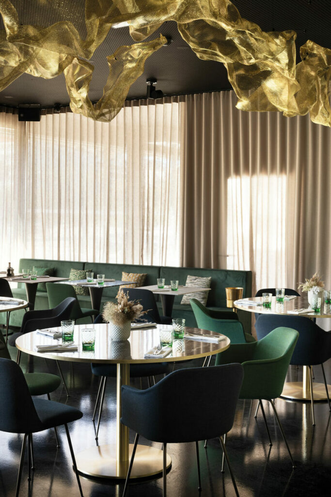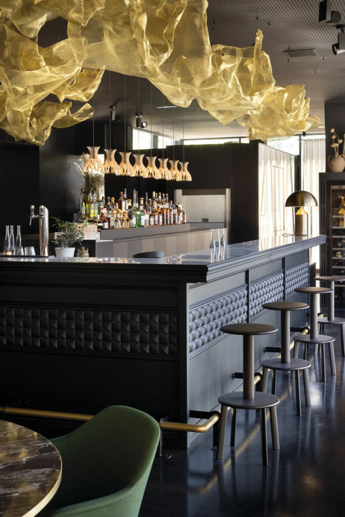 Sophie Petit : Oui, mais revisités. Nous nous sommes inspirés du luxe des brasseries parisiennes : la maille dorée au plafond rappelle à la fois les méandres des étangs, les filets des pêcheurs et une certaine sophistication. Le doré est à la fois une couleur et une matière dans ce projet. Il dialogue avec la lumière naturelle, qui est magnifique ici. Cela crée des reflets changeants au fil de la journée. Les tissus, en maille beige brute, apportent une texture plus naturelle, tandis qu’une banquette en velours donne une touche plus chaleureuse et élégante.