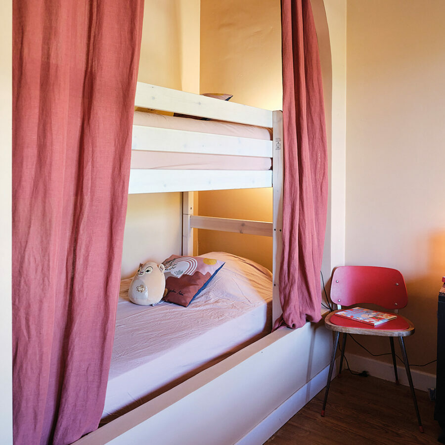 Dans la chambre des filles, j’ai travaillé un terracotta qui rappelle les couchers de soleil sur l’Atlantique, dans ma chambre une teinte douce, légèrement brumeuse comme une fin d’après-midi d’automne dans les sous-bois. Les accessoires, et notamment le linge de lit jouent également un très grand rôle dans les ambiances et les teintes. J’ai pris l’initiative de peindre les plafonds des chambres des mêmes couleurs que les murs afin d’agrandir l’espace.