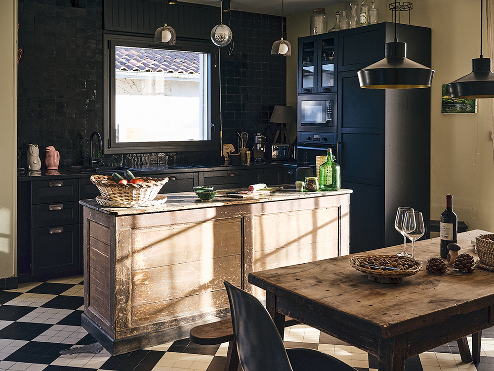 Ma cuisine ! Cette petite boîte noire avec son sol en damier noir et blanc et son comptoir chiné est l’endroit où je passe le plus clair de mon temps. Très tôt le matin je m’assois, avec vue sur la forêt, ensuite je passe des heures en cuisine à faire des plats qui mijotent longtemps. J’adore le mix de couleurs, les zelliges noirs, le mobilier ancien, et puis surtout mes petits poissons en céramique qui semblent nager vers le large de peur que je les mette dans ma casserole !