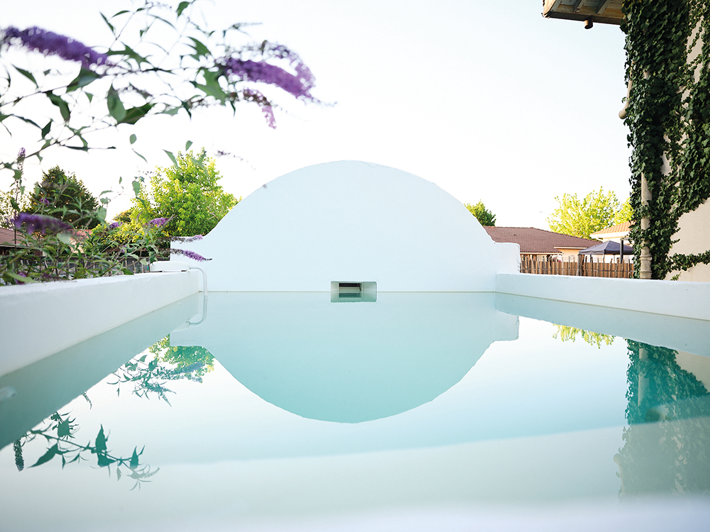 Une terrasse habillée de larges pierres blondes posées en quinconce et son bassin d’eau claire dessinée par Jessica comme une ancienne fontaine de village sont une oasis de sérénité. La bâtisse est aujourd’hui en osmose avec la nature environnante grâce à l’immense porte-fenêtre faisant traverser l’air et la lumière de toutes parts.